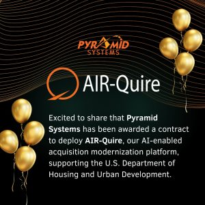 Read MoreModernizing federal acquisition isn’t a prototype anymore — it’s operational reality. We’re proud to share that Pyramid Systems has been awarded work under the U.S. Department of Housing and Urban Development’s Office of the Chief Information Officer (OCIO) Acquisition Modernization Support Services (AMSS) contract — bringing our AI-powered platform, AIR-Quire, to support HUD’s next-generation acquisition…